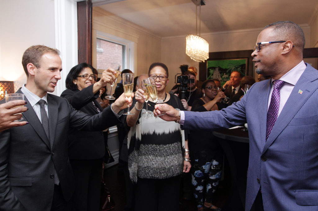 Ottawa, Ontario (16 June, 2017) – Amid senior government officials from Canada, members of the Ottawa diplomatic corps and proud citizens of St. Kitts and Nevis, the Federation`s Minister of Foreign Affairs, Honourable Mark Brantley, and Honourable Matt Decourcey raised glasses in honour of the establishment of the Federation`s chancery in Ottawa.