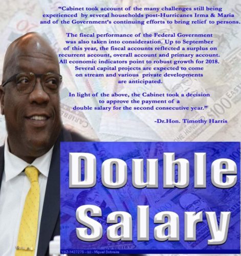 BASSETERRE, St. Kitts, December 5, 2017 (Press Unit in the Office of the Prime Minister) – Praises continue to pour in for the Team Unity administration of St. Kitts and Nevis for its decision to pay a 13-month salary, otherwise known as a double salary, to all civil servants of the Federal and Nevis Island Administration this month.