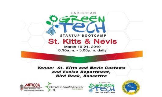 Basseterre, St. Kitts, March 15, 2019 (SKNIS): Clean Tech Entrepreneurs are being encouraged to attend a three-day Caribbean Green Tech Start-up Bootcamp, from March 19 to 21, at the St. Kitts and Nevis Customs and Excise Department, to access basic business education, mentorship and finance in order to further develop their green sector businesses.