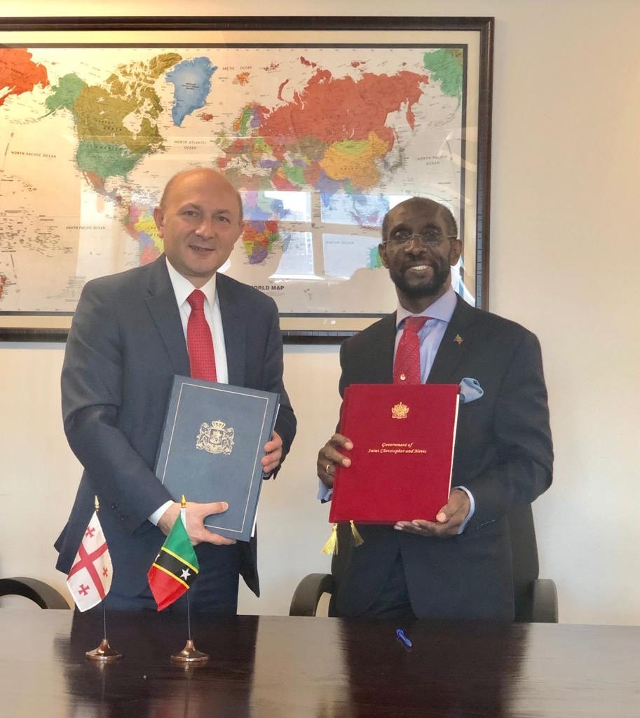 New York, 15 July 2019—The Permanent Representative of St. Kitts and Nevis to the United Nations, His Excellency Sam Condor, signs a Visa Waiver Agreement with His Excellency Mr. Kaha Imnadze Permanent Representative of Georgia to grant visa-free access between the two countries. According to the agreements, holders of diplomatic, official and ordinary passports are permitted entry without a visa into the Federation of St. Kitts and Nevis and Georgia, for a period not exceeding ninety (90) days in any one hundred eighty (180) days period.