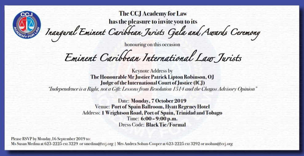 Port of Spain, Trinidad and Tobago. The CCJ Academy for Law will host the inaugural Eminent Caribbean Jurists Gala and Awards Ceremony on October 7, 2019 at the Hyatt Regency Trinidad. This event, which will honour the contributions of the region’s distinguished judicial officers and legal professionals to the development of international law, will be the first of its kind in the Caribbean region.
