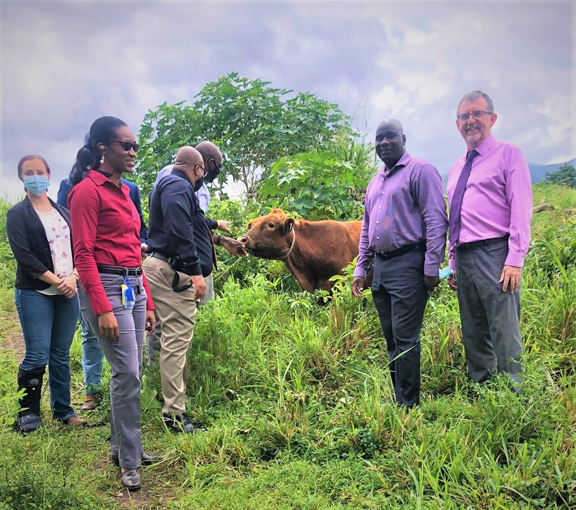 | Basseterre, St. Kitts, November 14, 2020 (SKNIS): In an effort to further advance the Agricultural product within the Federation of St. Kitts and Nevis, the Ross University School of Veterinary Medicine is contributing to the livestock sector with donating new breeds of cattle and sheep to the Department of Agriculture in an initiative called “livestock breeding initiative”. According to President of the American Association of Bovine Practitioners, Tyler Oxley, the purpose of the initiative is to grow the Federation’s national herd and diversify the genetic pool and to allow for the long term goal of St. Kitts and Nevis becoming self-sustainable in its production of cattle. During a handing over ceremony at Mansion on November 12, Associate Professor Dr. Aspinas Chapwanya said that “We are happy again to be able to be here on this day where we are still enhancing our livestock production on the island.” He added, “The Ross students that have been instrumental in the programme have put together some money and acquired a bull that they will be donating to the Department of Agriculture.” Minister of Agriculture, Honourable Alexis Jeffers, who accepted the donation on behalf of the Department of Agriculture said, “It gives me great pleasure to stand here and express how thankful we are and profound that this particular initiative is for the Federation of St. Kitts and Nevis.” “We are receiving this bull this morning and I want to say that we have seen the demand for beef and beef products here in the Federation … more particularly, we have seen an increase in the demand for beef burgers and also ground beef,” said Honourable Jeffers. He added, “Many persons who are displaced at this time who would have worked in the service industry have found themselves in small businesses that are utilising some of these products both in Nevis and St. Kitts.” Others who attended the handing over ceremony were the Permanent Secretary in the Ministry of Agriculture, Ron Dublin-Collins, Dean of Ross University School of Veterinary Medicine, Dr. Sean Callanan, President of the American Association of Bovine Practitioners, Tyler Oxley, and Ross student Kaitlyn Guidry. -30- |