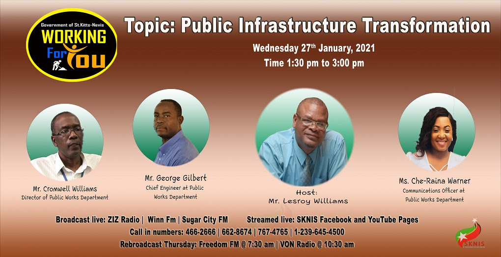Basseterre, St. Kitts, January 26, 2021 (SKNIS): Officials from the Public Works Department will be featured on the popular government radio and television programme “Working for You” on Wednesday, January 27, 2021.