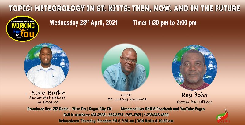 Basseterre, St. Kitts, April 27, 2021 (SKNIS): Officials from the St. Kitts Meteorological Office will be featured on the popular government radio and television programme “Working for You” on Wednesday, April 28, 2021.