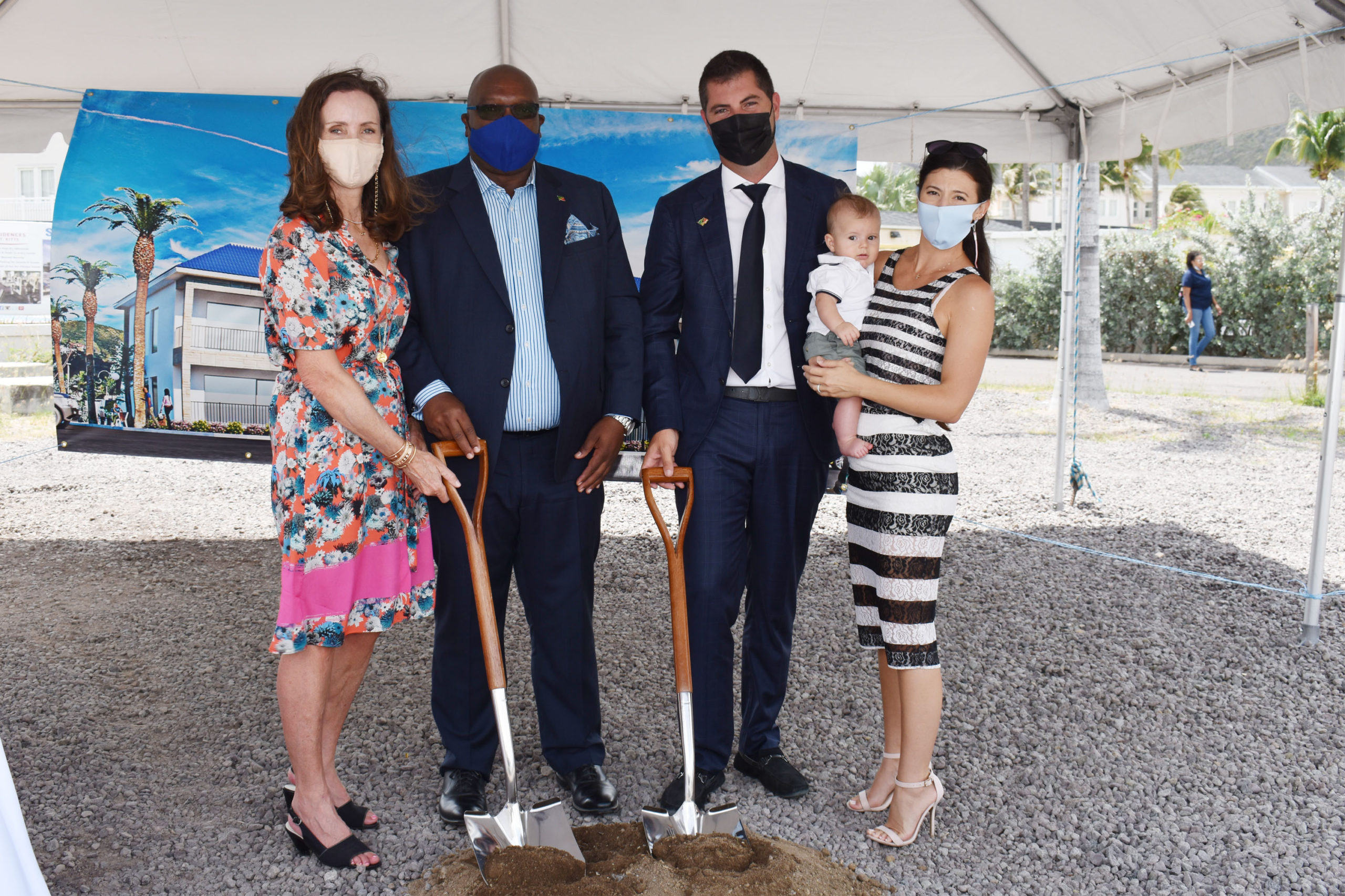 Turning of the sod was done by Prime Minister Dr the Hon Timothy Harris, and Mr John Zuliani. They were later joined by Dr Danielle Zuliani, wife of Mr Zuliani, and her five-month-old son, Archie Zuliani, and Mr Zuliani’s Mother, Dr Ursula Higgins.