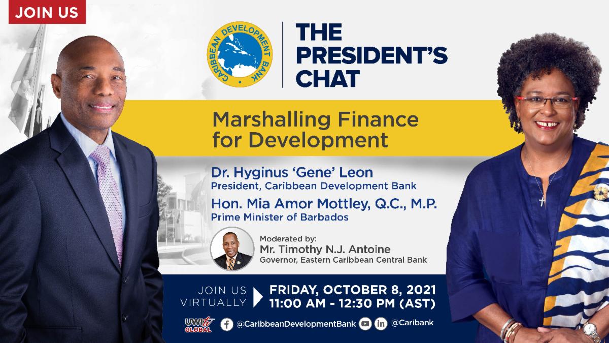 Friday, October 8, 2021, 11:00 AM (AST)The Caribbean Development Bank’s (CDB) President, Dr Gene Leon will host the Prime Minister of Barbados, Hon. Mia Amor Mottley, Q.C., M.P., as his featured guest on the second edition of The President’s Chat scheduled for Friday October 8, 2021, at 11:00 am. The President’s Chat is a discussion programme which CDB launched earlier this year to promote high level dialogue on issues of regional significance between the Bank’s President and thought leaders and decision-makers.