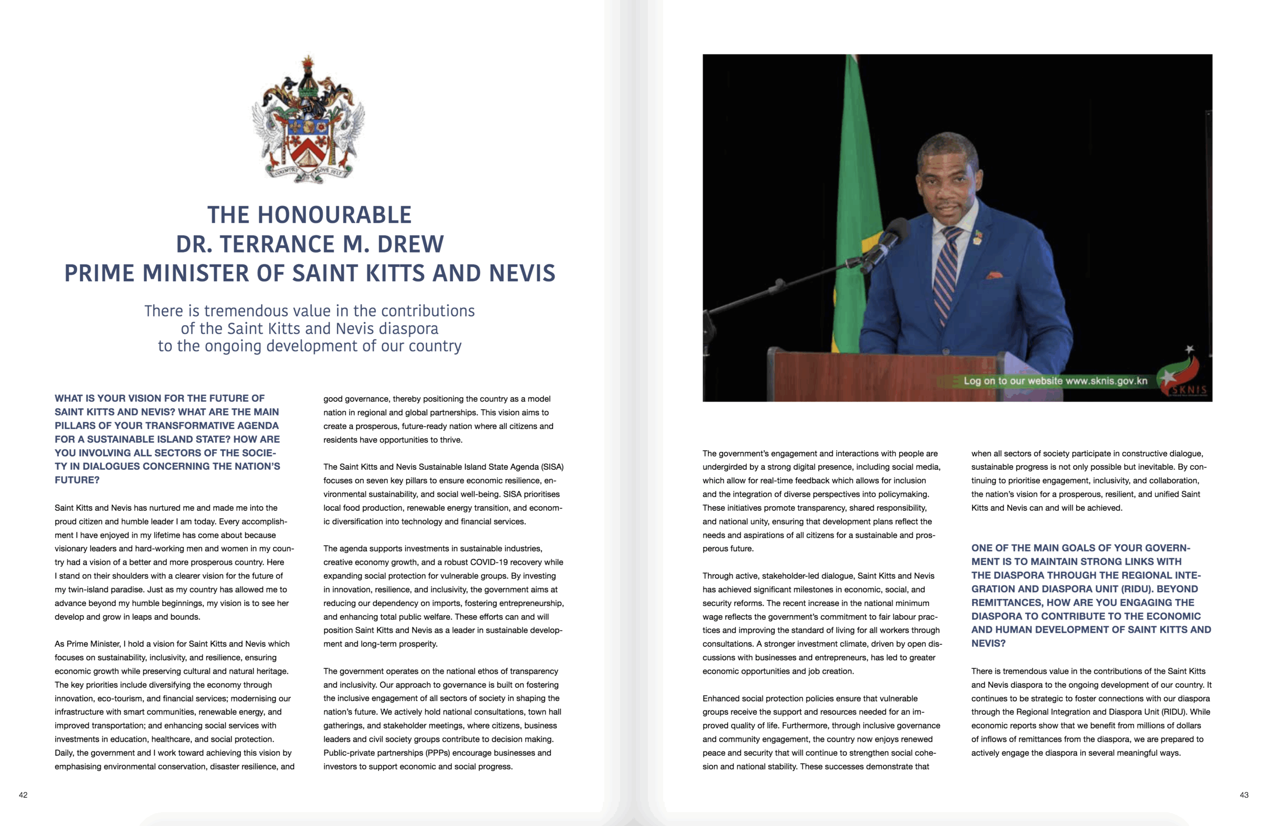 The multi-page feature, which spans pages 42 to 47 of the latest edition, provides readers with a compelling look at Dr. Drew’s transformative leadership and his government’s bold pursuit of sustainable national development. The article highlights the Prime Minister’s unwavering commitment to good governance, healthcare reform, renewable energy, and the development of St. Kitts and Nevis as a Sustainable Island State, a policy agenda that has garnered international attention and praise.