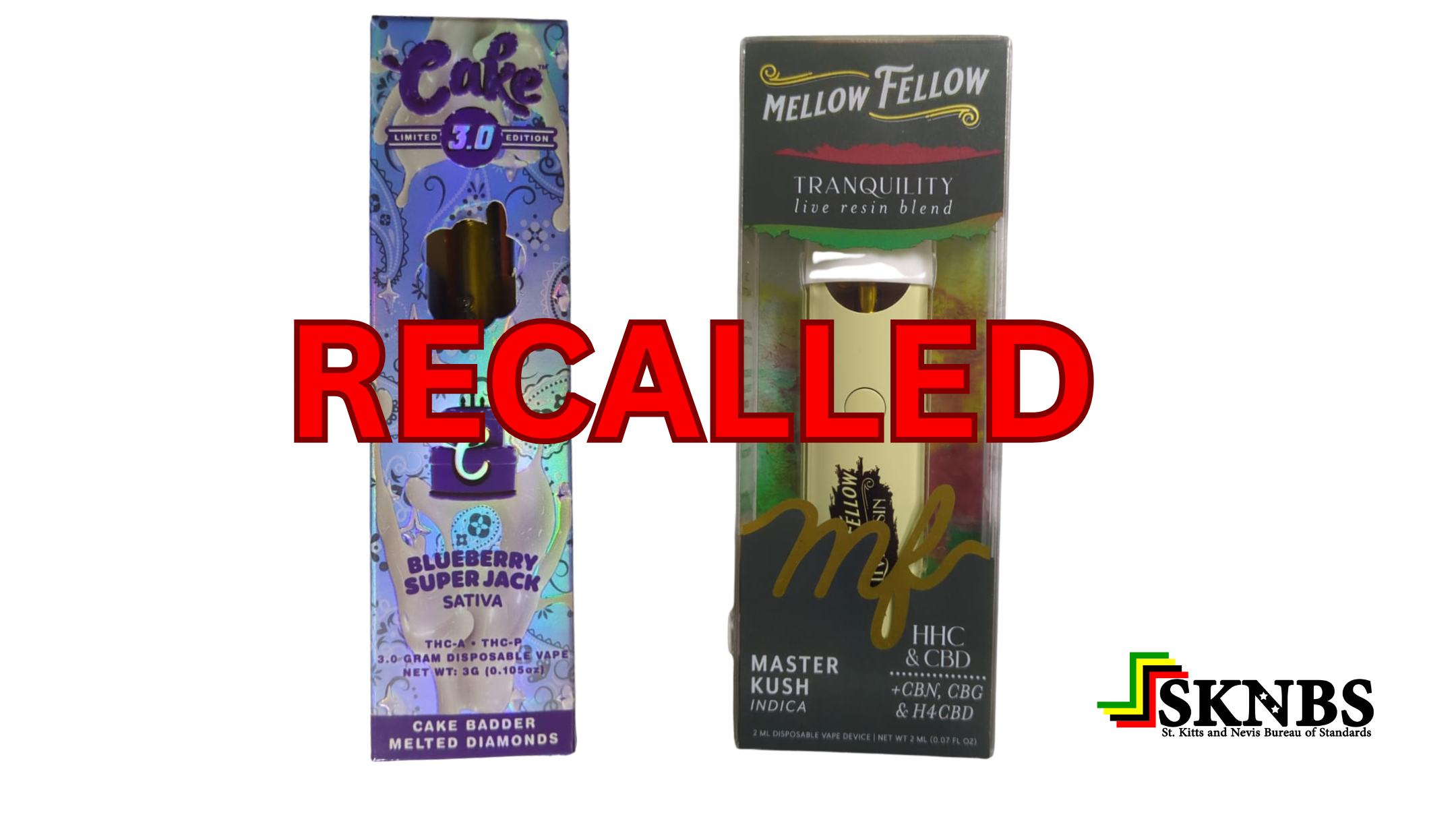 Basseterre, St. Kitts, November 20, 2025 (SKNBS): The Bureau of Standards issues a mandatory national recall for the products “Mellow Fellow: Tranquility 2ml vape device” and “Cake Blueberry Super Jack vape device” purchased during routine market surveillance from a registered retail business in St. Kitts and Nevis. These products, manufactured in the United States, are not approved under any national legislation, standard, or regulation within the Federation for trade or distribution.